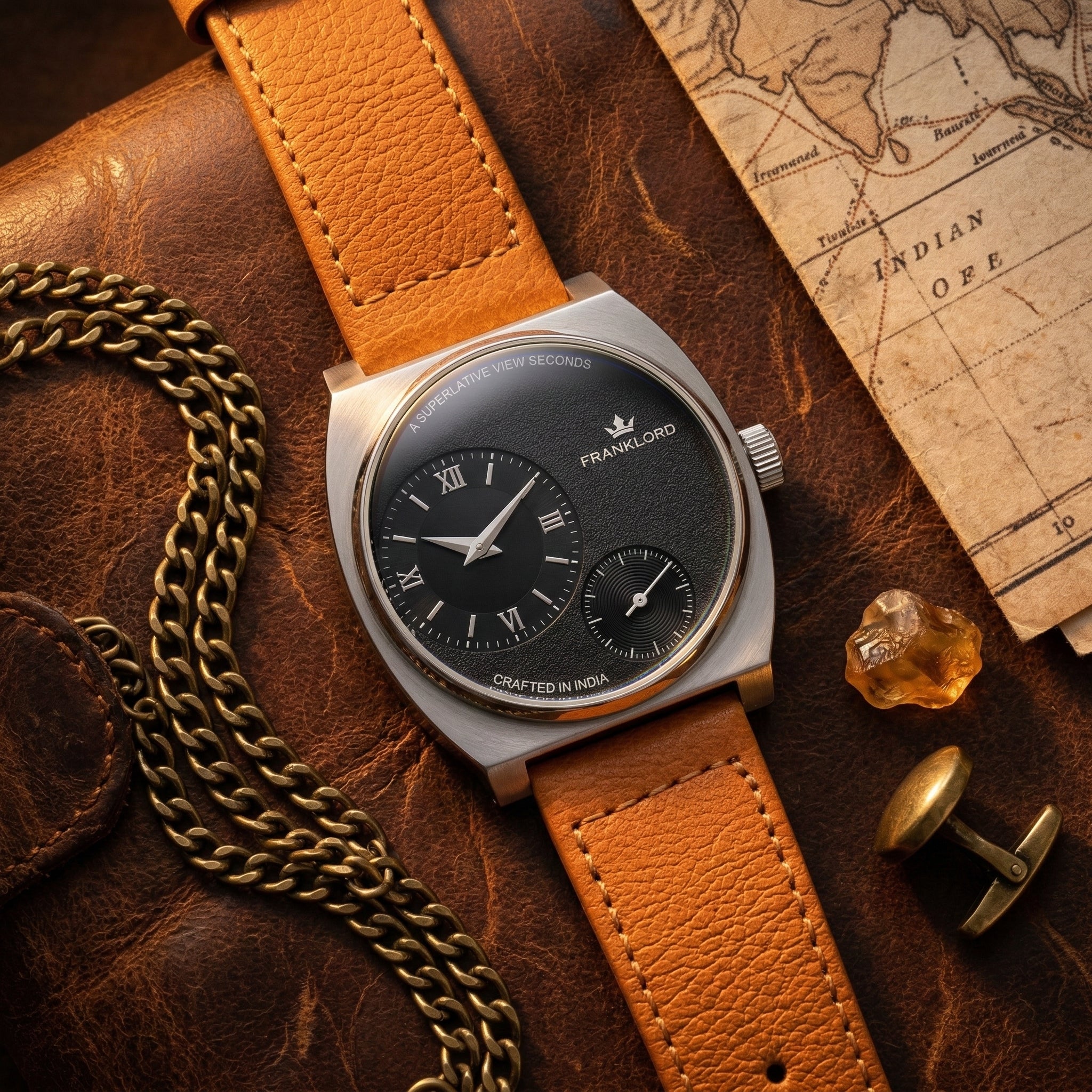 Introducing The Noir Heritage, the definitive classic of the Franklord Eccentrica Collection. This timepiece masterfully contrasts a deep, micro-sandblasted black dial with a vibrant vintage tan leather strap, creating a look that is bold yet traditionally grounded.