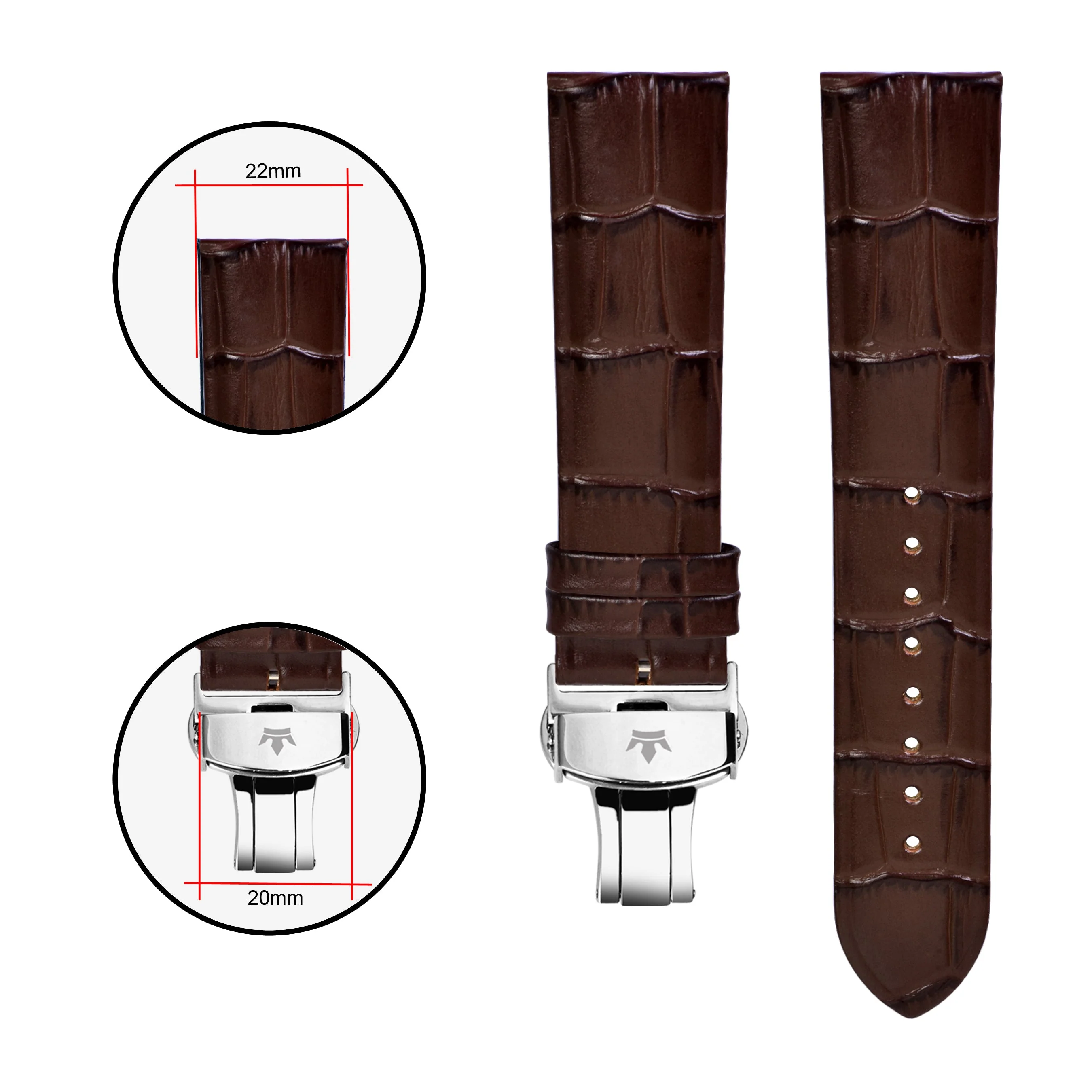 Elevate your watch game with this luxurious brown croc-embossed genuine leather strap. Designed for 22mm watches, this strap combines timeless style with unmatched durability. The stainless steel butterfly buckle offers a secure fit while adding a sophisticated touch. Whether paired with a dress watch or a classic timepiece, this strap is the perfect upgrade for any occasion.