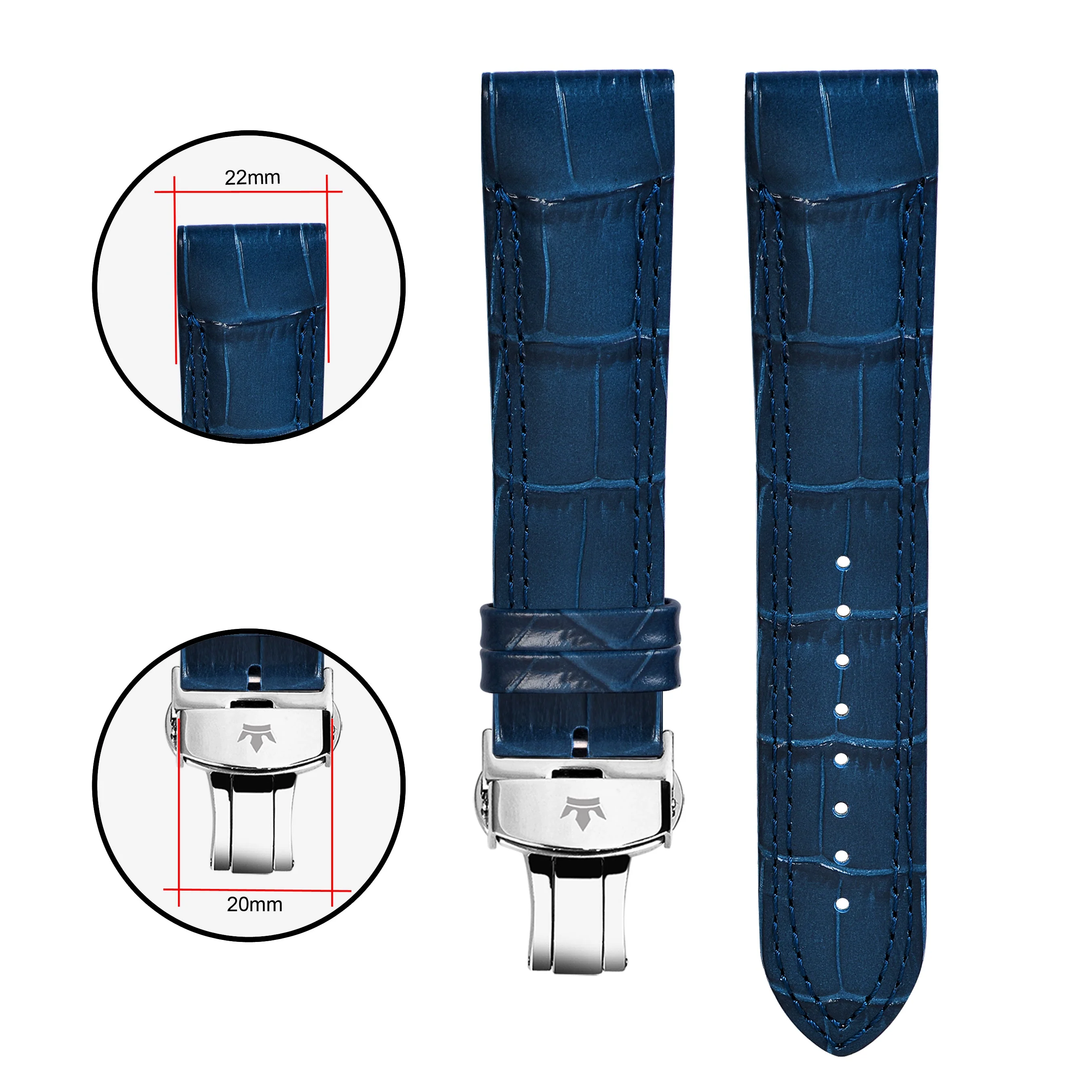 Enhance your watch's elegance with the Franklord Navy Blue Alligator-Style Leather Strap with matching stitching. This 22mm strap is expertly crafted from premium genuine leather, featuring a luxurious alligator-style texture and reinforced stitching for a sophisticated look. The stainless steel butterfly buckle ensures secure fit and effortless style. Perfect for formal occasions or casual refinement, this strap seamlessly combines timeless craftsmanship with contemporary design.