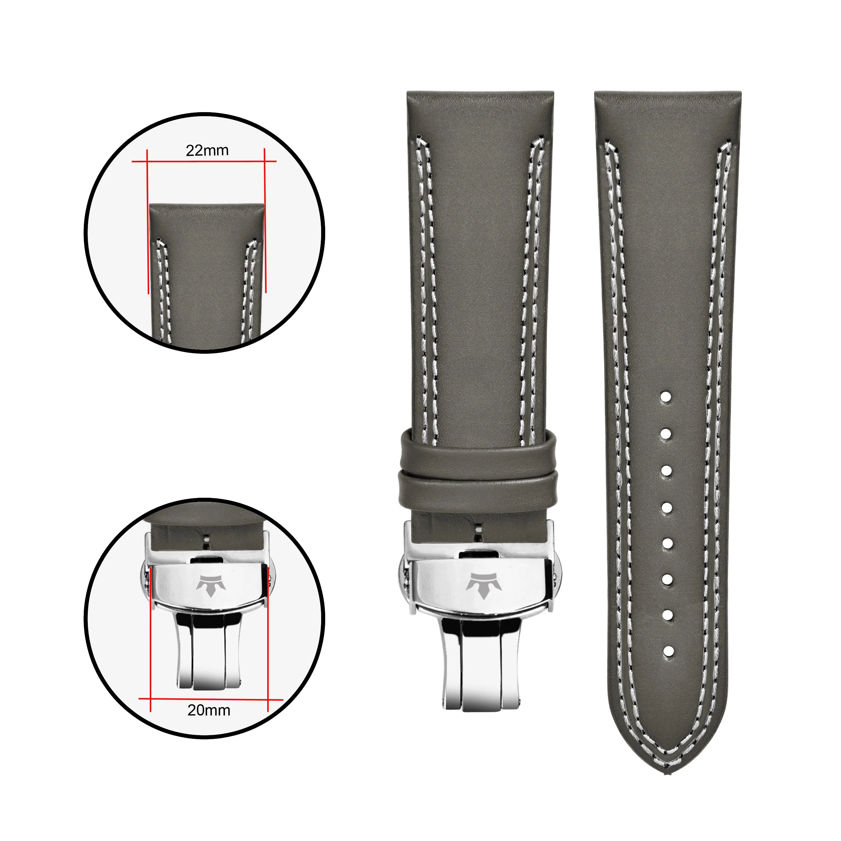 Enhance your watch's elegance with the Franklord Olive Green Leather Strap with White Stitching. Crafted from premium genuine leather, this 22mm strap combines classic style with modern durability. The white stitching adds a crisp, clean accent to the olive green leather, while the stainless steel butterfly buckle ensures a secure and sophisticated fit. Designed for versatility, this strap complements both formal and casual outfits, making it a must-have accessory for your timepiece.