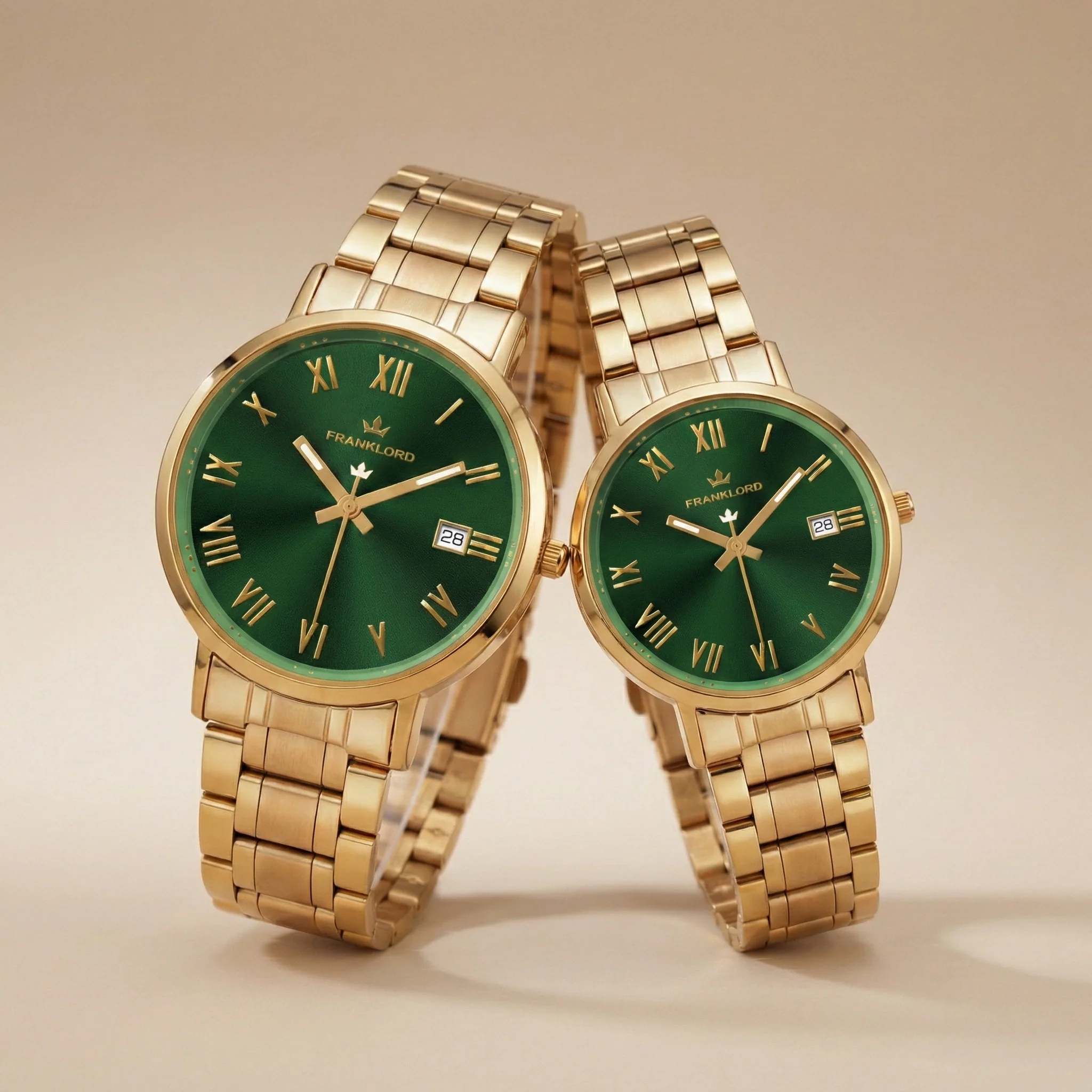 Designed for the Power Couple Each watch in this set is a masterpiece of craftsmanship. The deep green dials capture the light with a mesmerizing sunburst effect, offset by the rich warmth of high-quality IPG Gold plating. Whether for a wedding gift, an anniversary, or a symbol of your shared journey, this set makes a statement of unity and ambition.