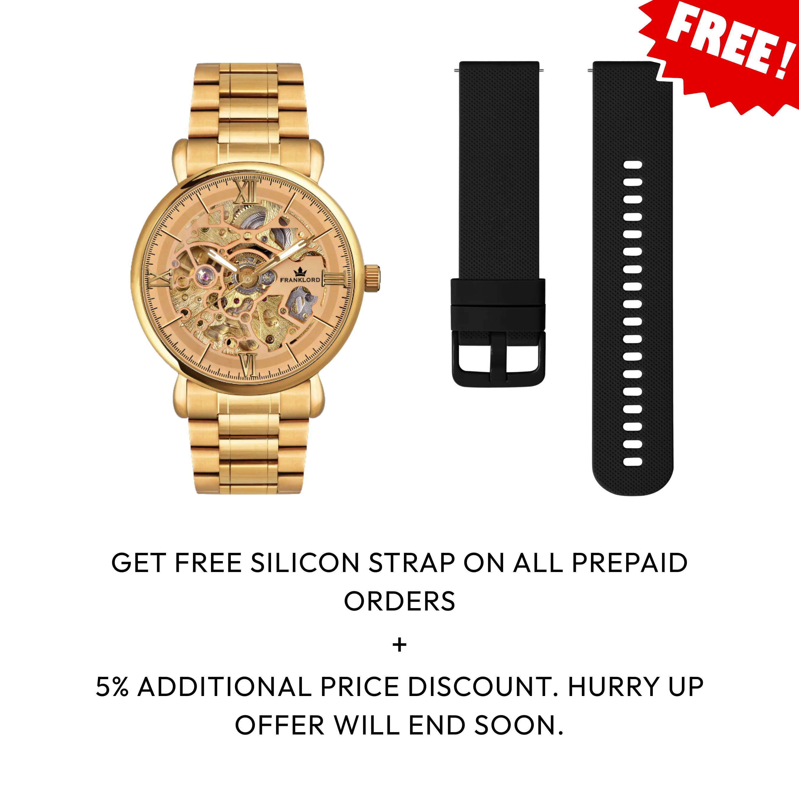 A celebration of opulence and precision, the Franklord Mechanis Regal Gold is designed for individuals who appreciate luxury and craftsmanship. Featuring a radiant gold-tone skeleton dial, intricate mechanical detailing, and a transparent see-through back, this masterpiece effortlessly combines classic aesthetics with modern performance.