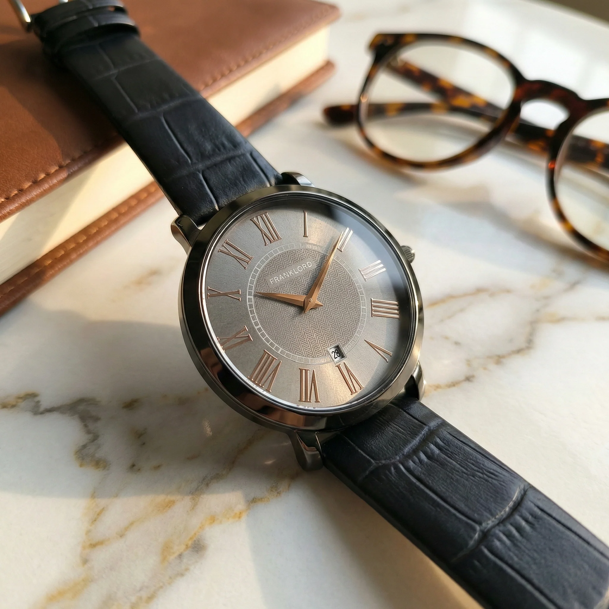 The Classic Roman in Graphite Rose is designed for the urban sophisticate. It moves away from tradition to offer a striking, contemporary aesthetic. The dial features a cool, slate-grey texture that catches the light beautifully, housed within a polished Gunmetal finish case that exudes understated power.