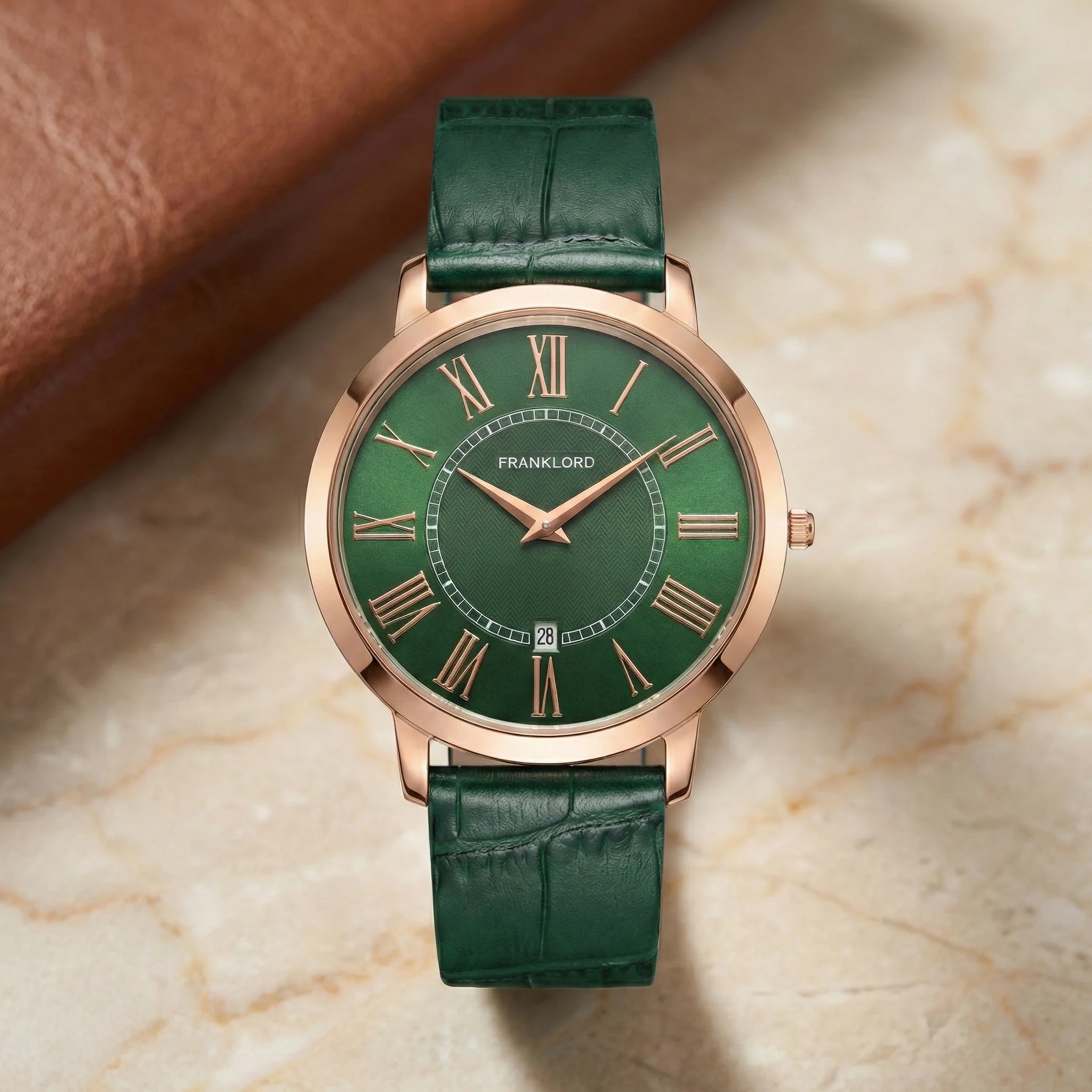 The Classic Roman in Imperial Green is not just a watch; it is a statement of distinct taste. This variant pairs a deep, emerald green sunburst dial with a luxurious Rose Gold casing—a color combination often associated with royalty and prosperity.