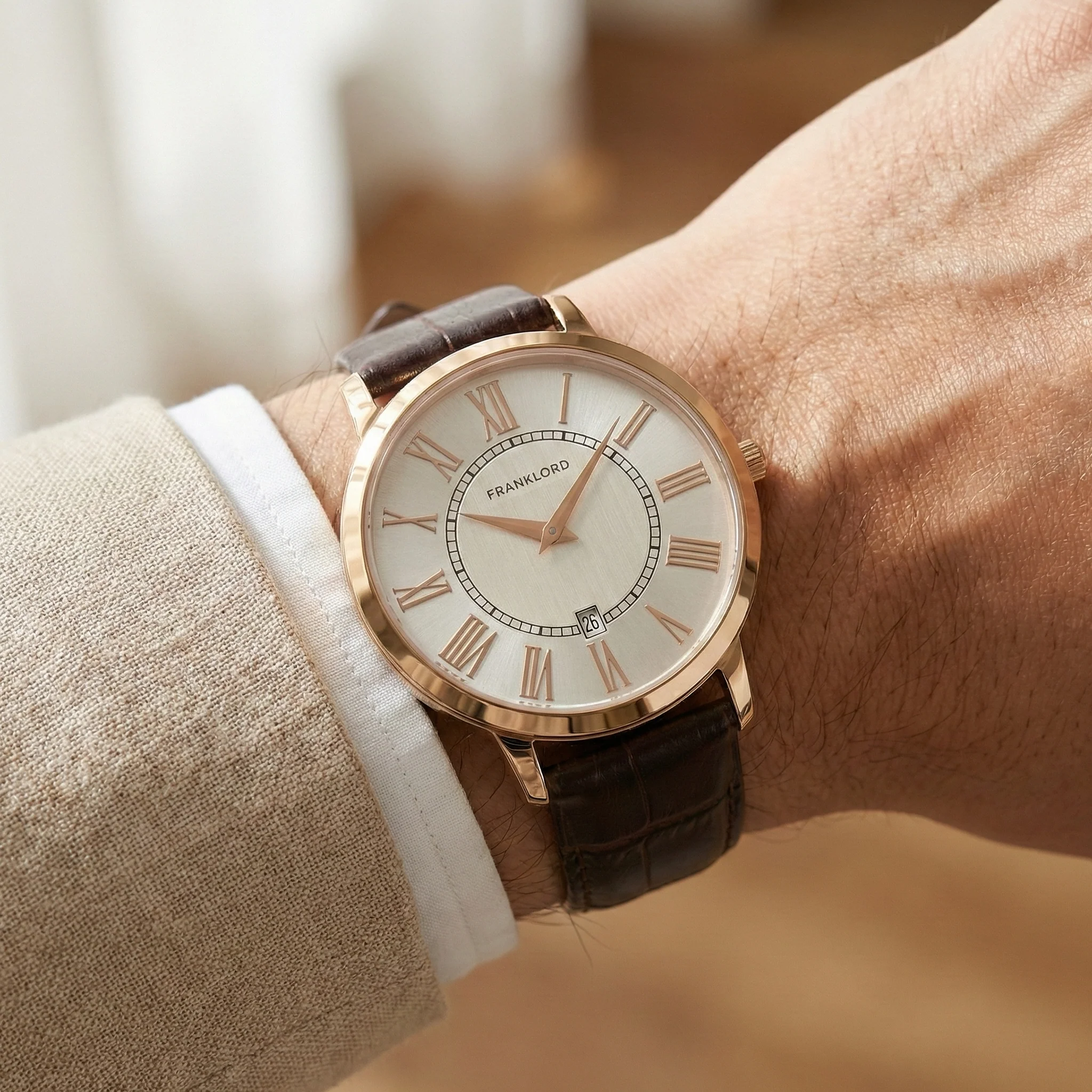The Classic Roman in Ivory Gold is the quintessential gentleman's timepiece. It features a crisp, clean Ivory White dial paired with a lustrous Rose Gold case—a color combination that has defined luxury watchmaking for decades. This is the watch you wear when you want to look sharp without trying too hard.